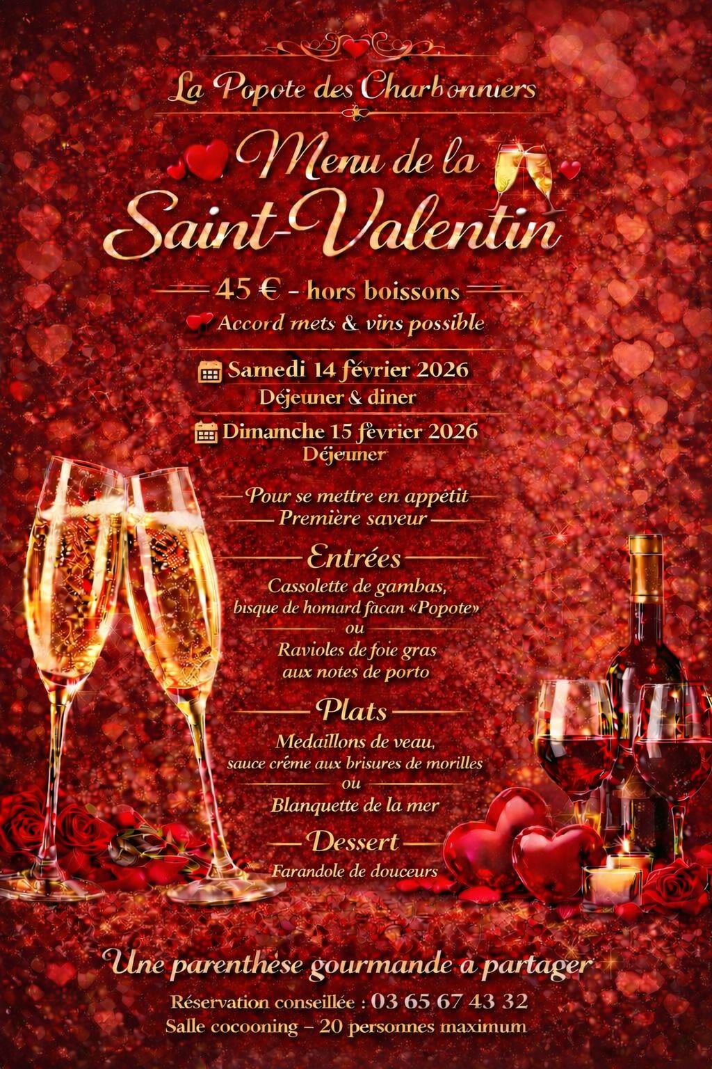Pour la Saint-Valentin, laissez-vous porter par un moment de douceur, avec un menu spécialement imaginé pour les amoureux, mettant à l'honneur une cuisine traditionnelle faite maison.